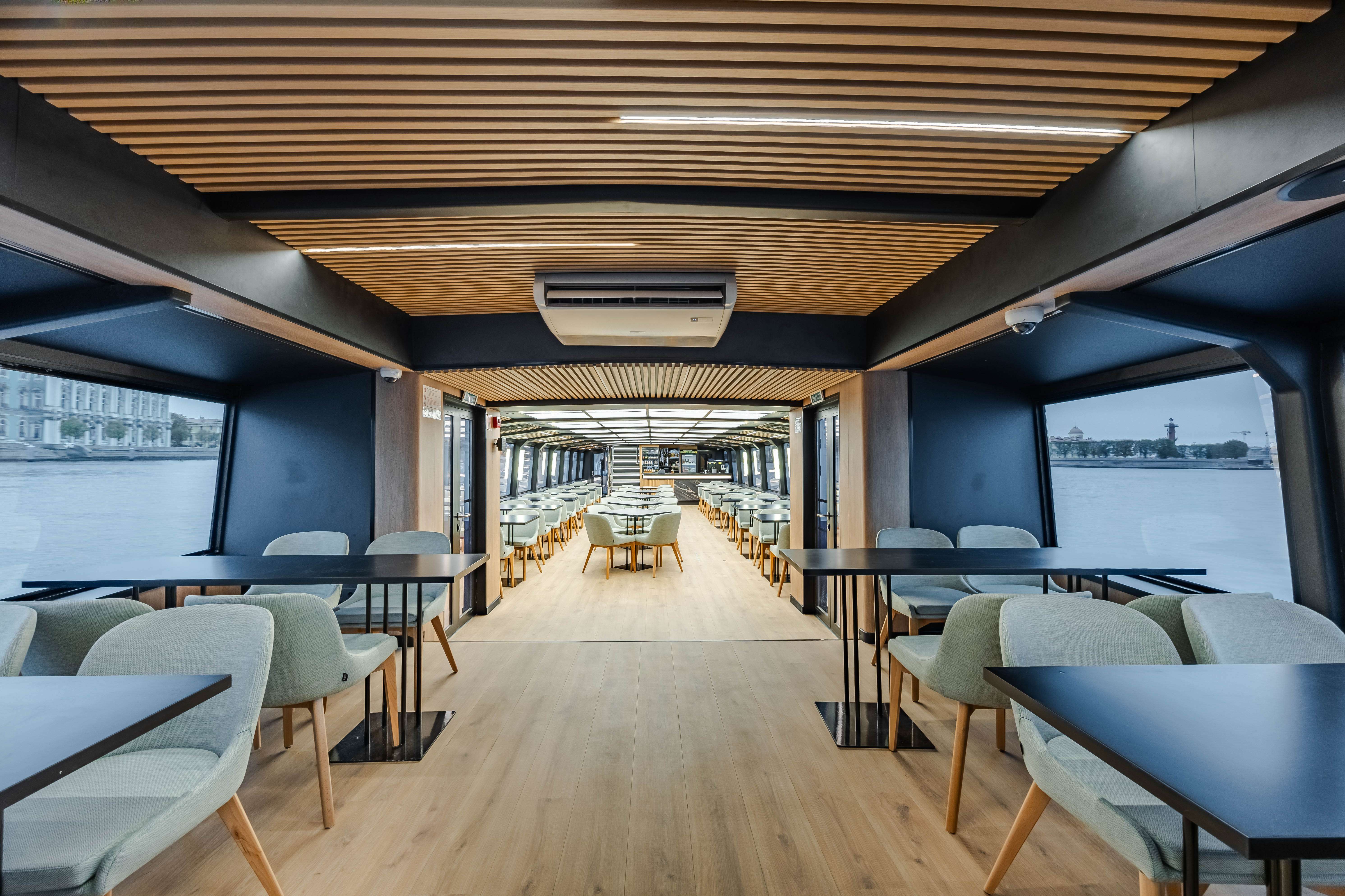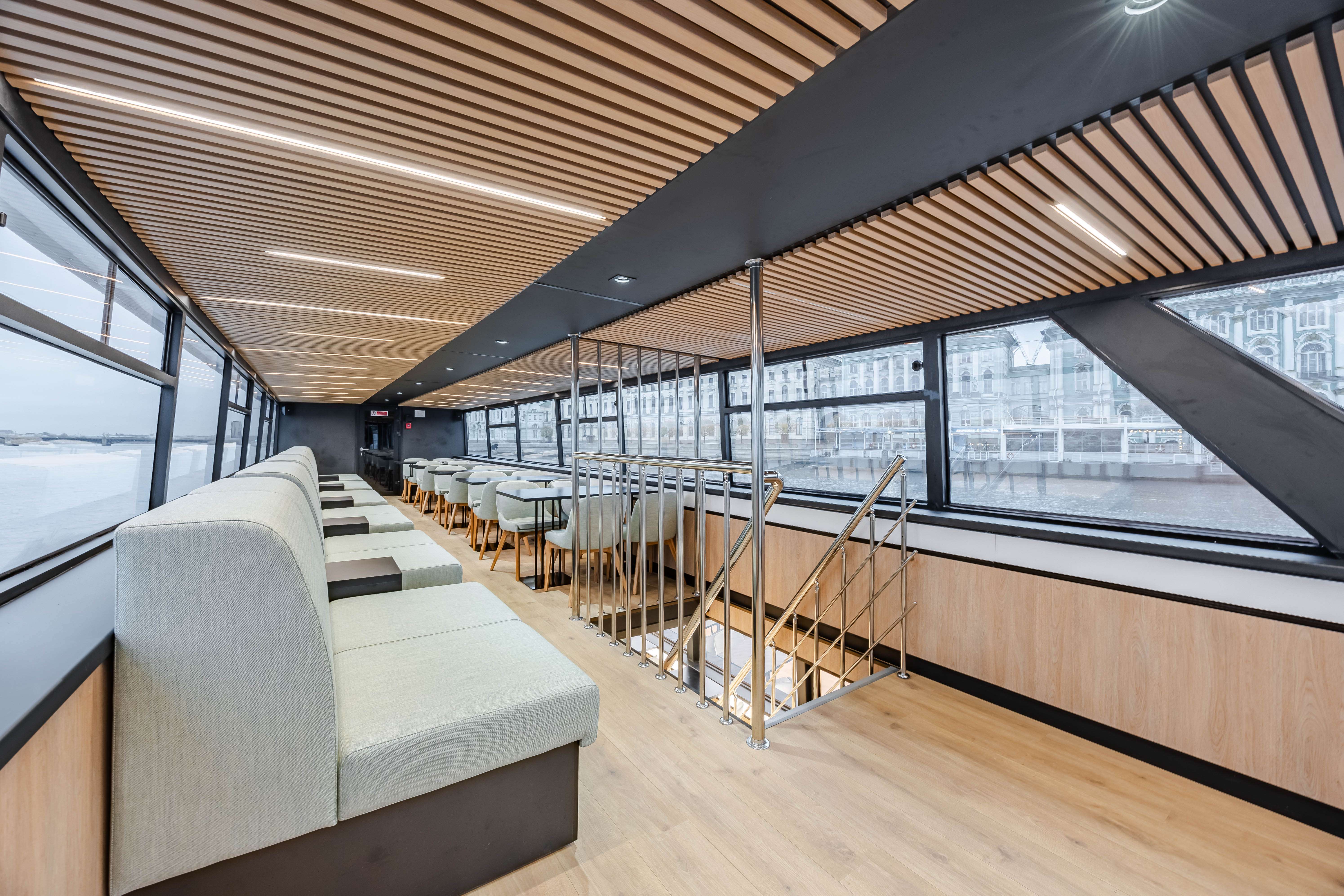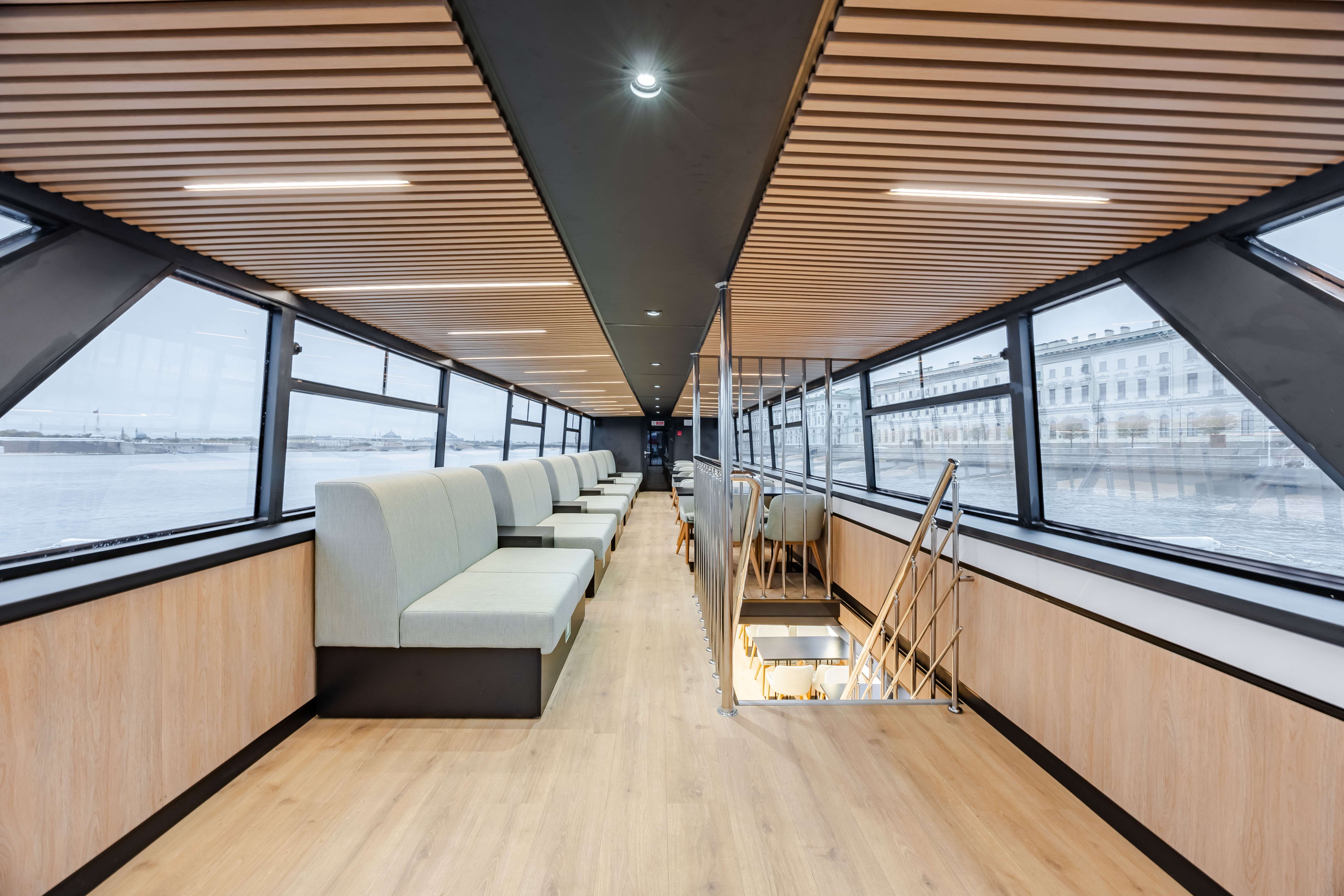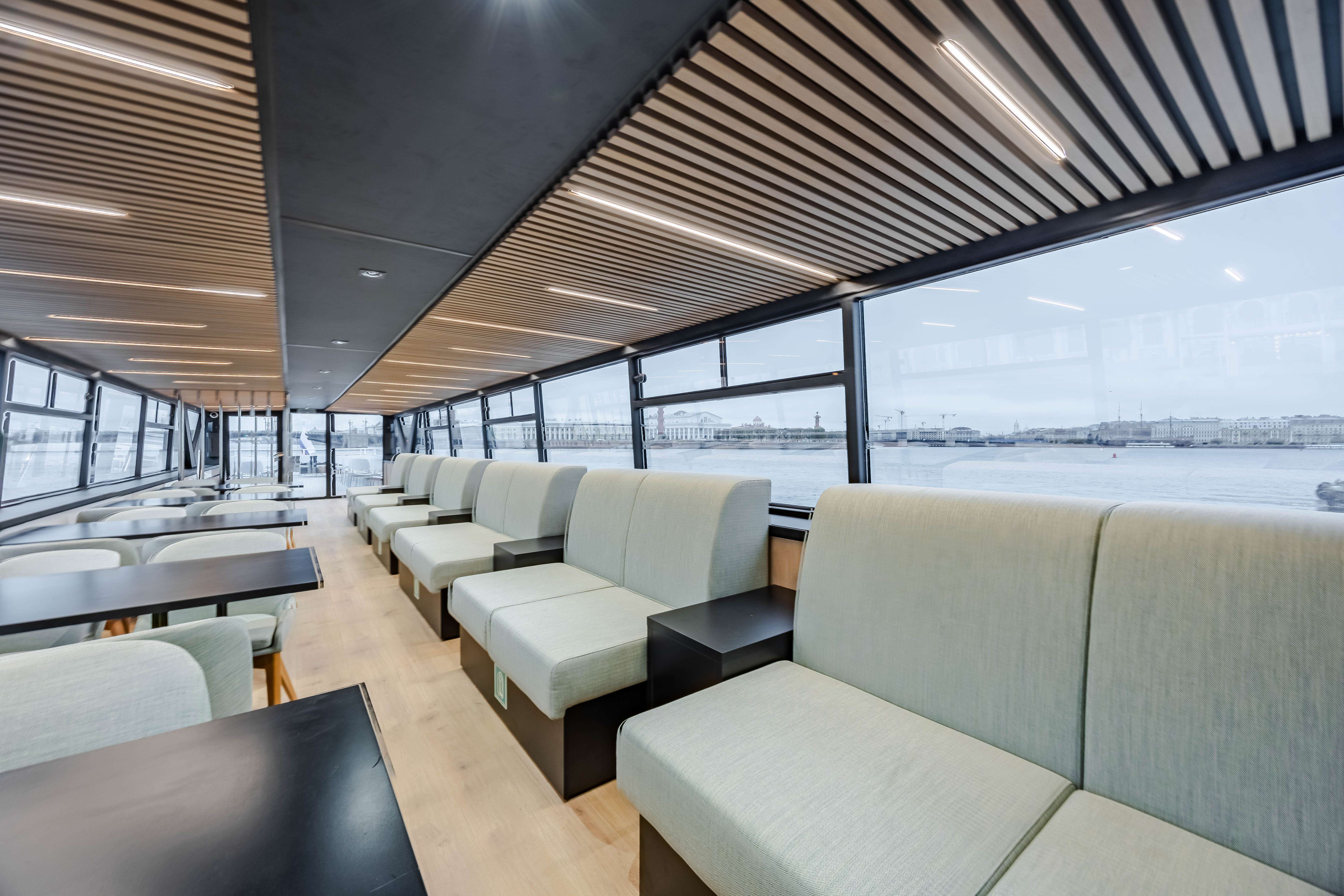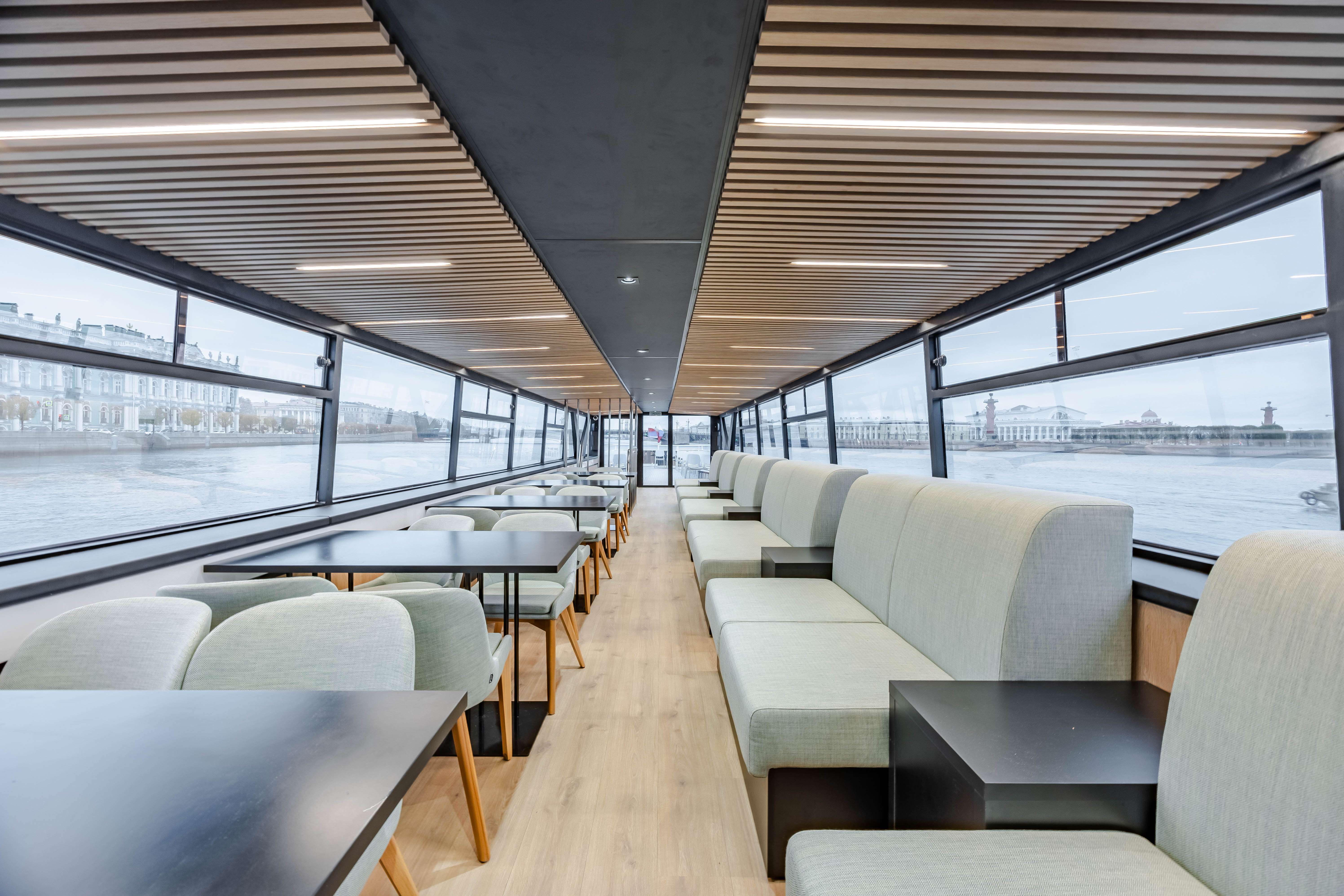 Теплоход «Москва 183» — комфортное двухпалубное судно, прошедшее реновацию в 2025 году. Просторный салон оформлен в светлых песочных тонах, а мозаичные элементы в интерьере создают особую атмосферу. Благодаря большим панорамным окнам с теплохода открываются прекрасные виды на Санкт-Петербург. Удобные посадочные места позволяют разместить гостей с комфортом, что делает судно подходящим для проведения экскурсий, торжественных мероприятий и деловых встреч.