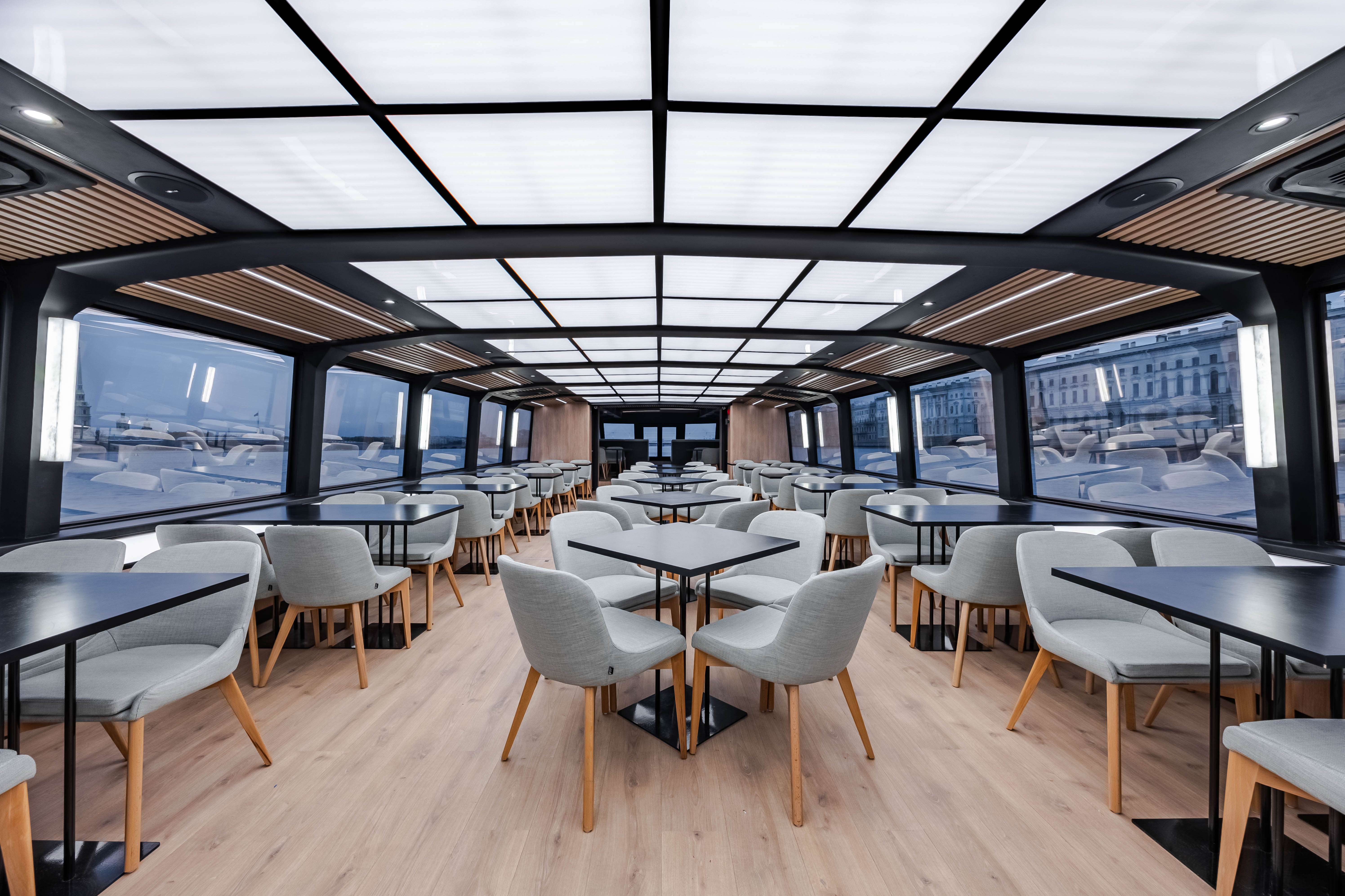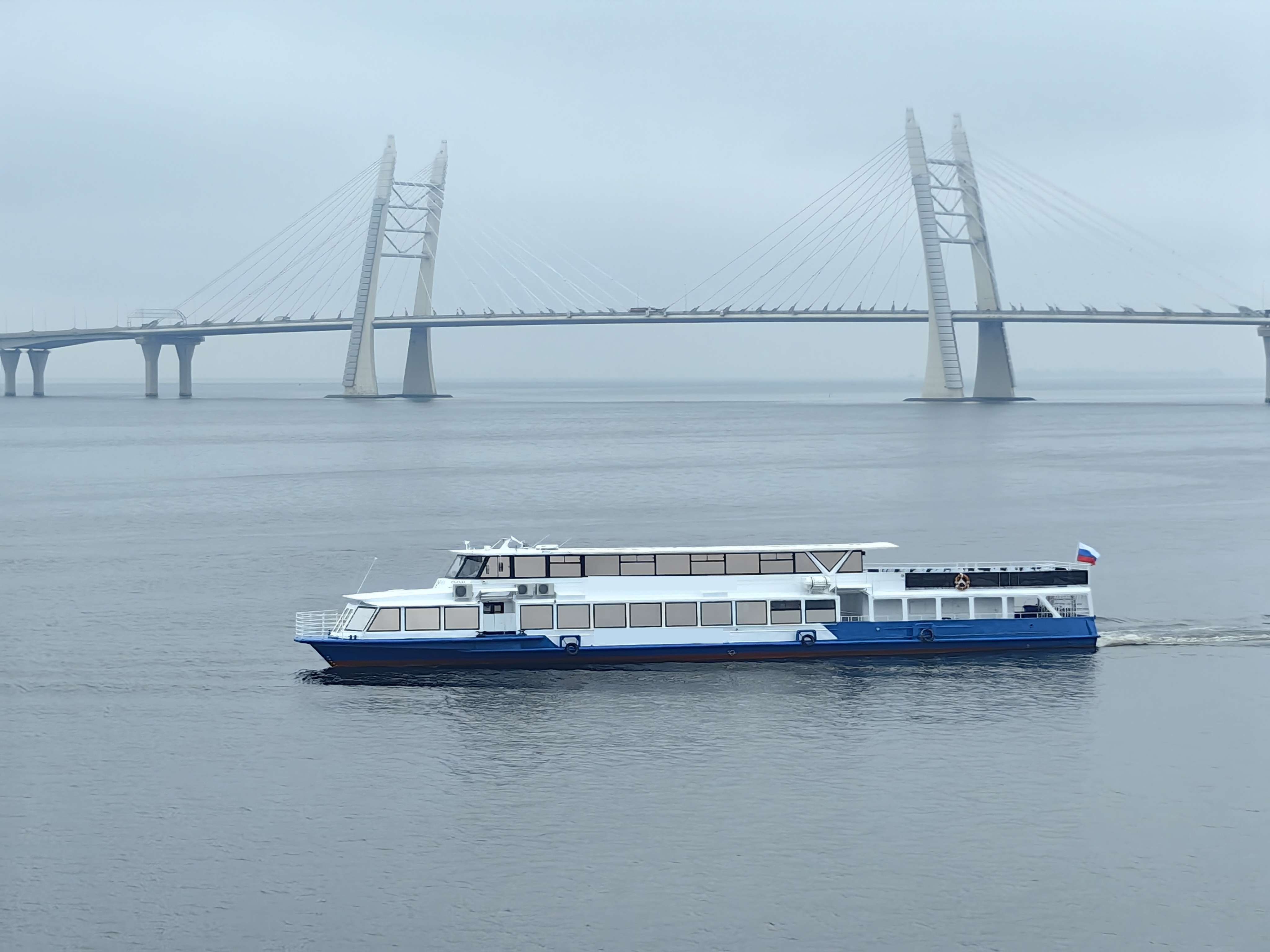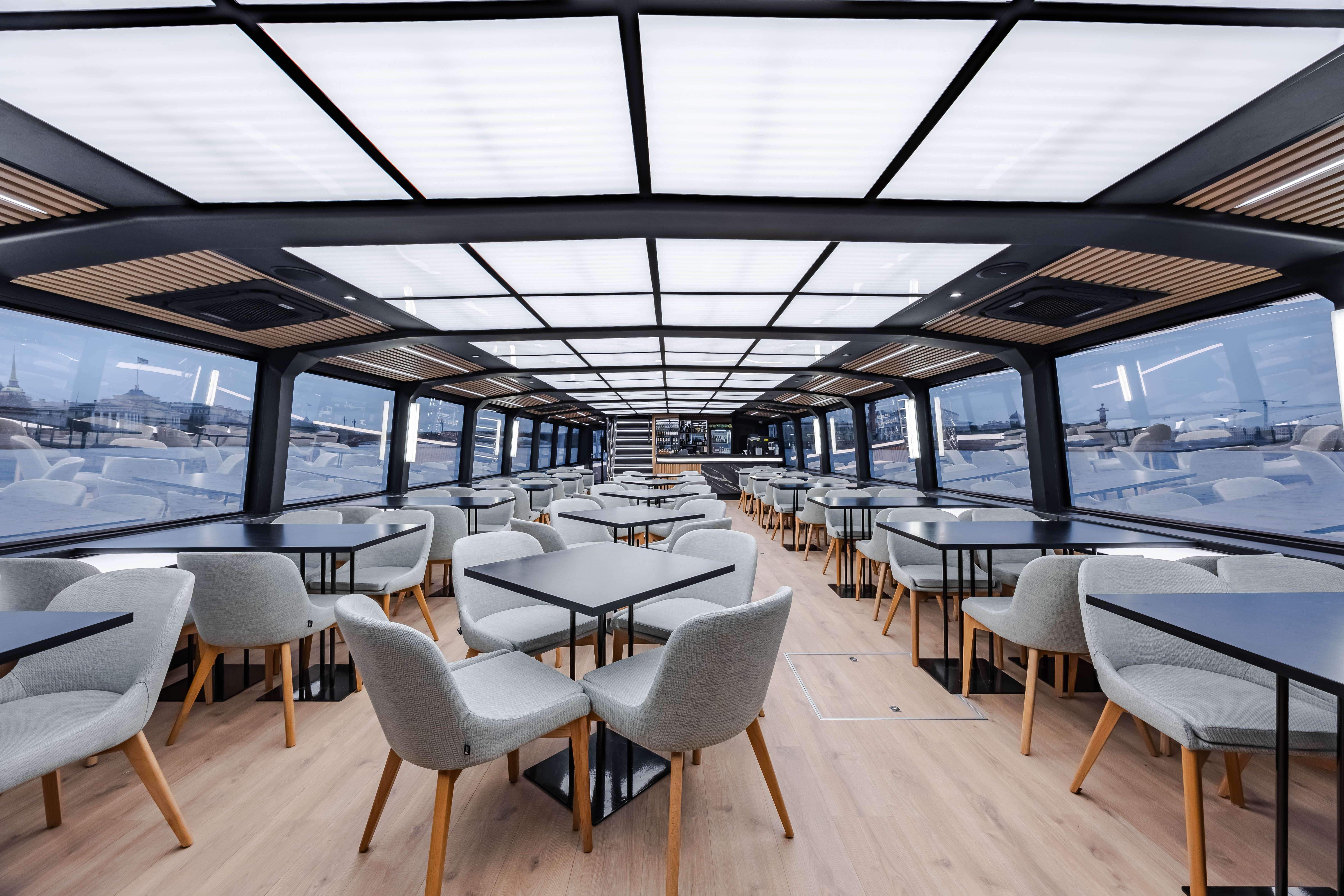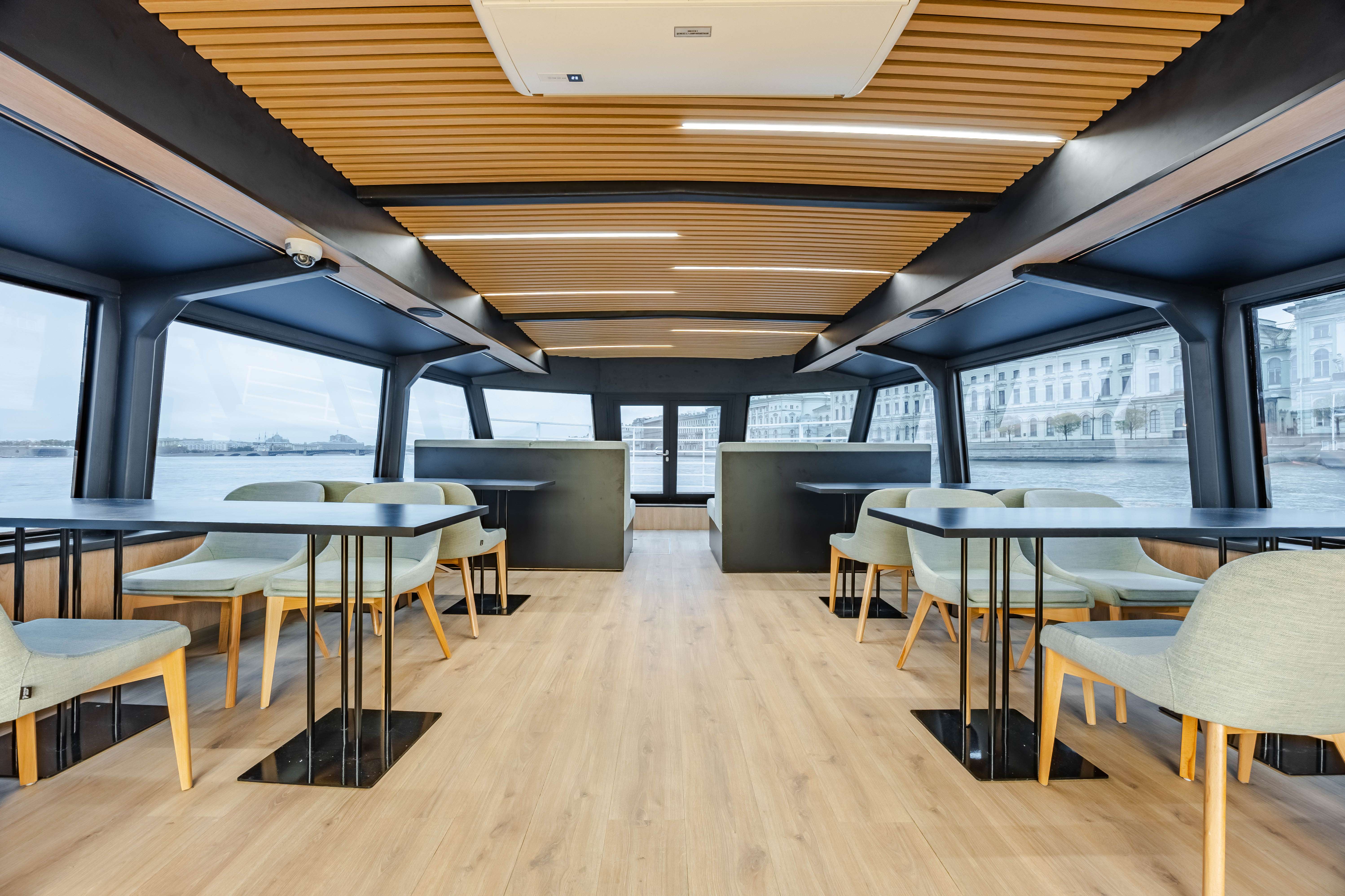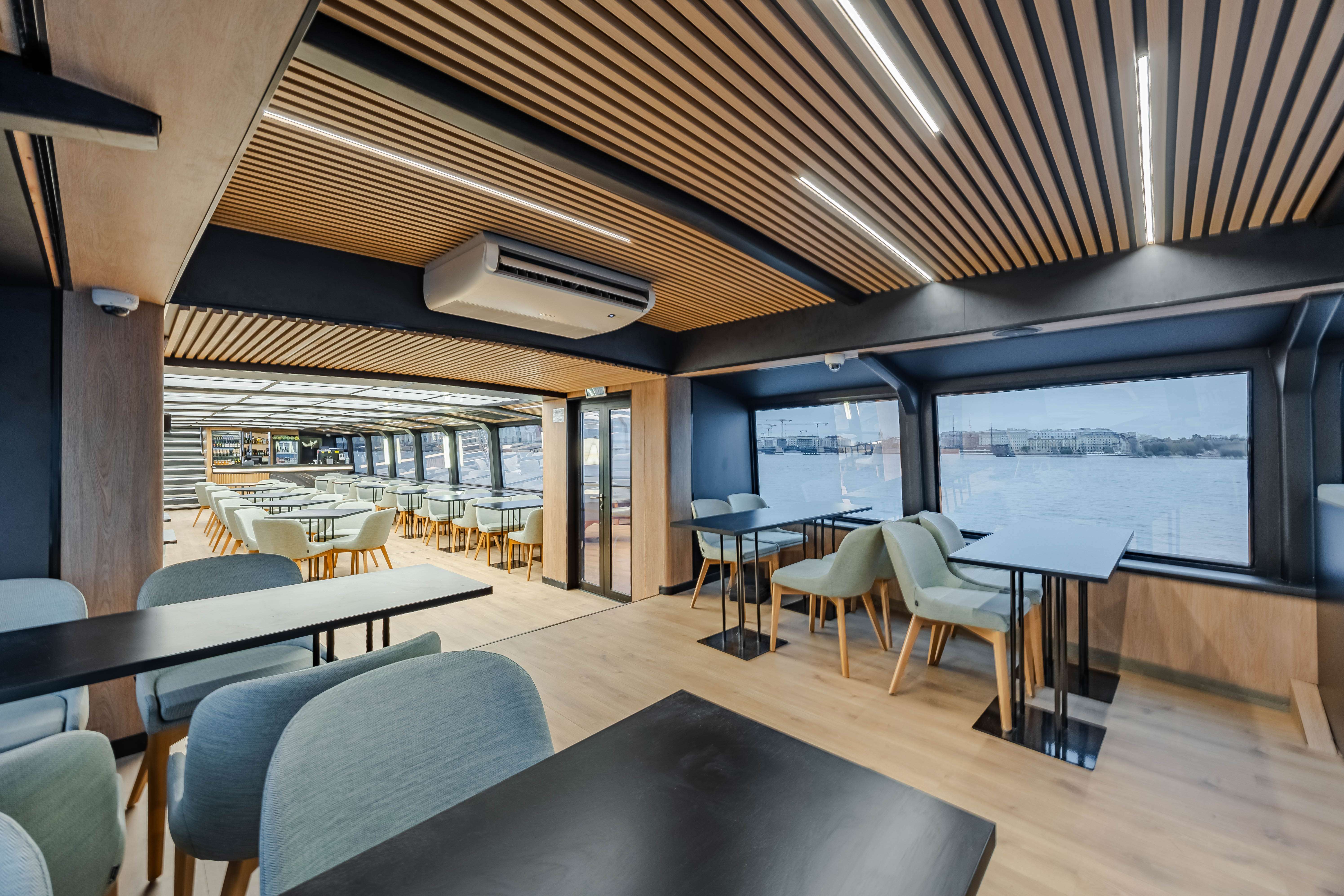 Теплоход «Москва 183» — комфортное двухпалубное судно, прошедшее реновацию в 2025 году. Просторный салон оформлен в светлых песочных тонах, а мозаичные элементы в интерьере создают особую атмосферу. Благодаря большим панорамным окнам с теплохода открываются прекрасные виды на Санкт-Петербург. Удобные посадочные места позволяют разместить гостей с комфортом, что делает судно подходящим для проведения экскурсий, торжественных мероприятий и деловых встреч.
