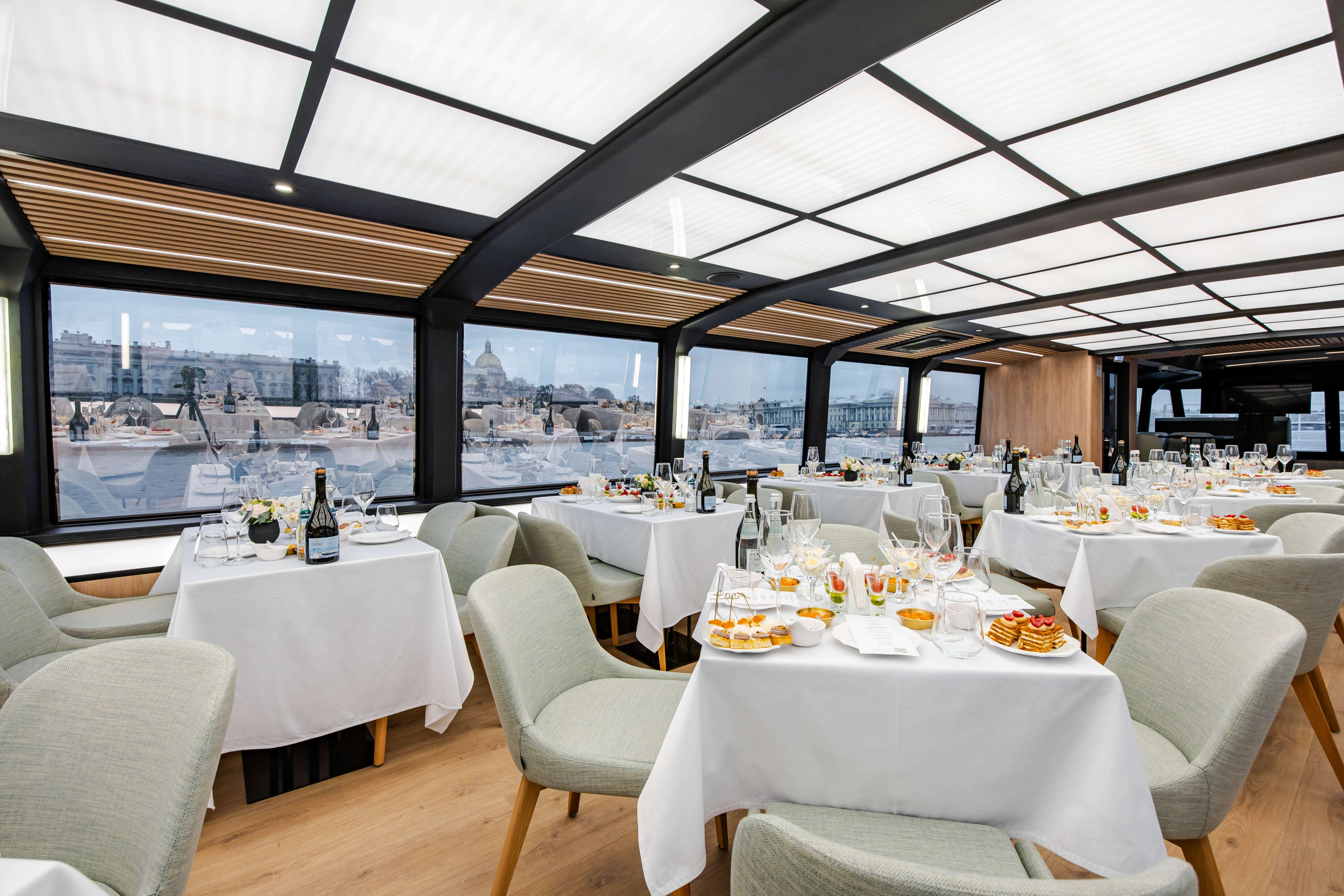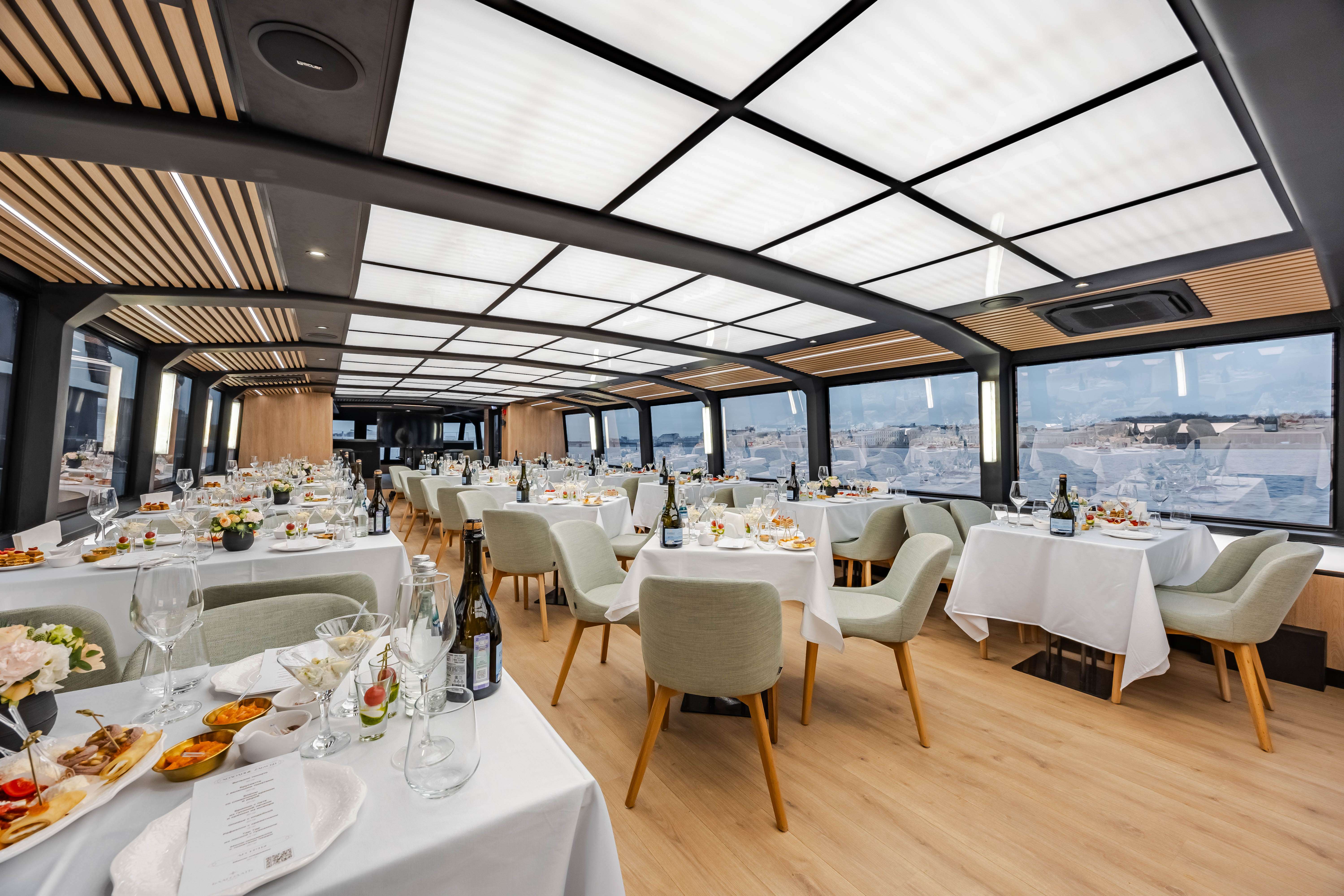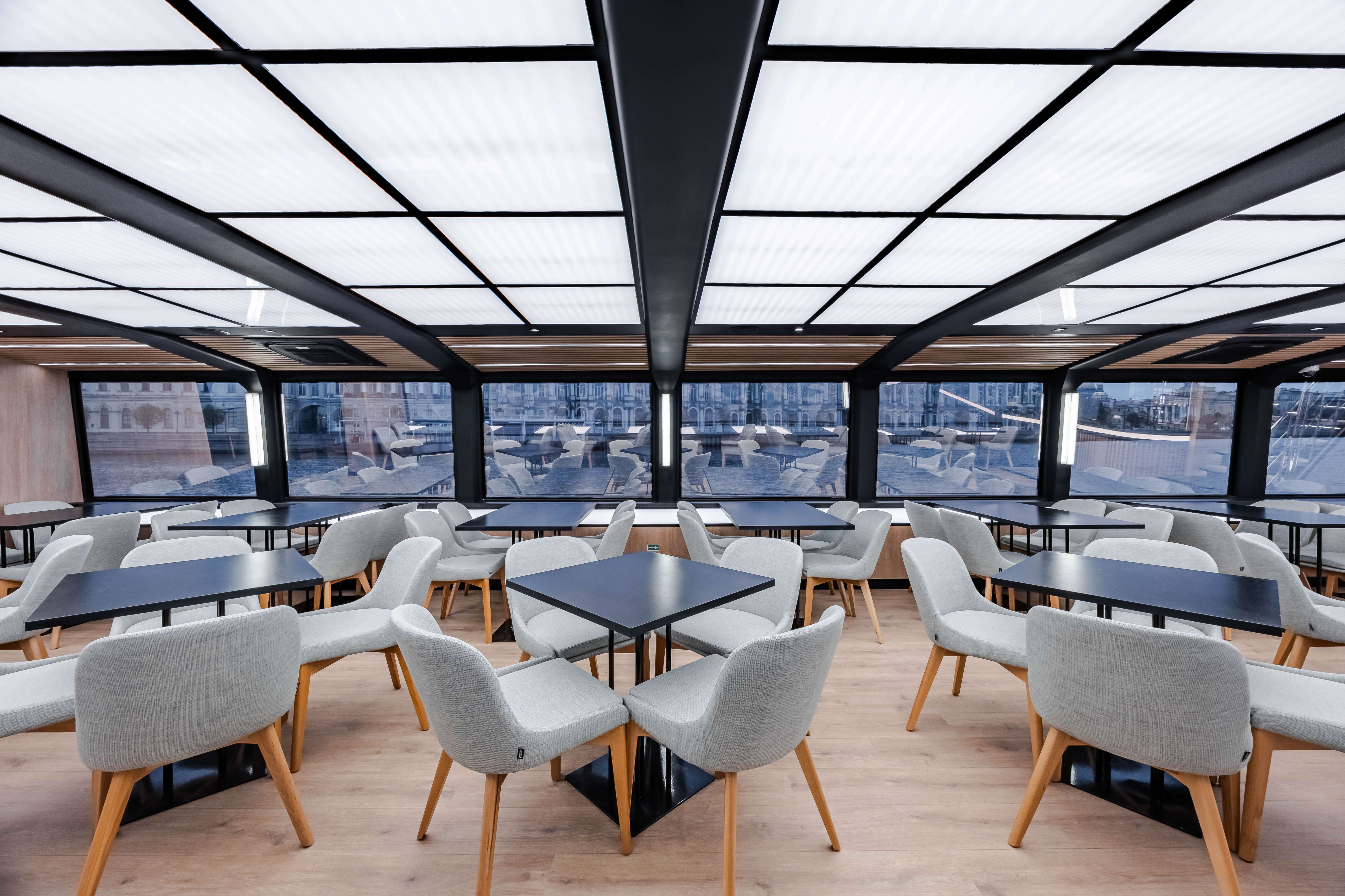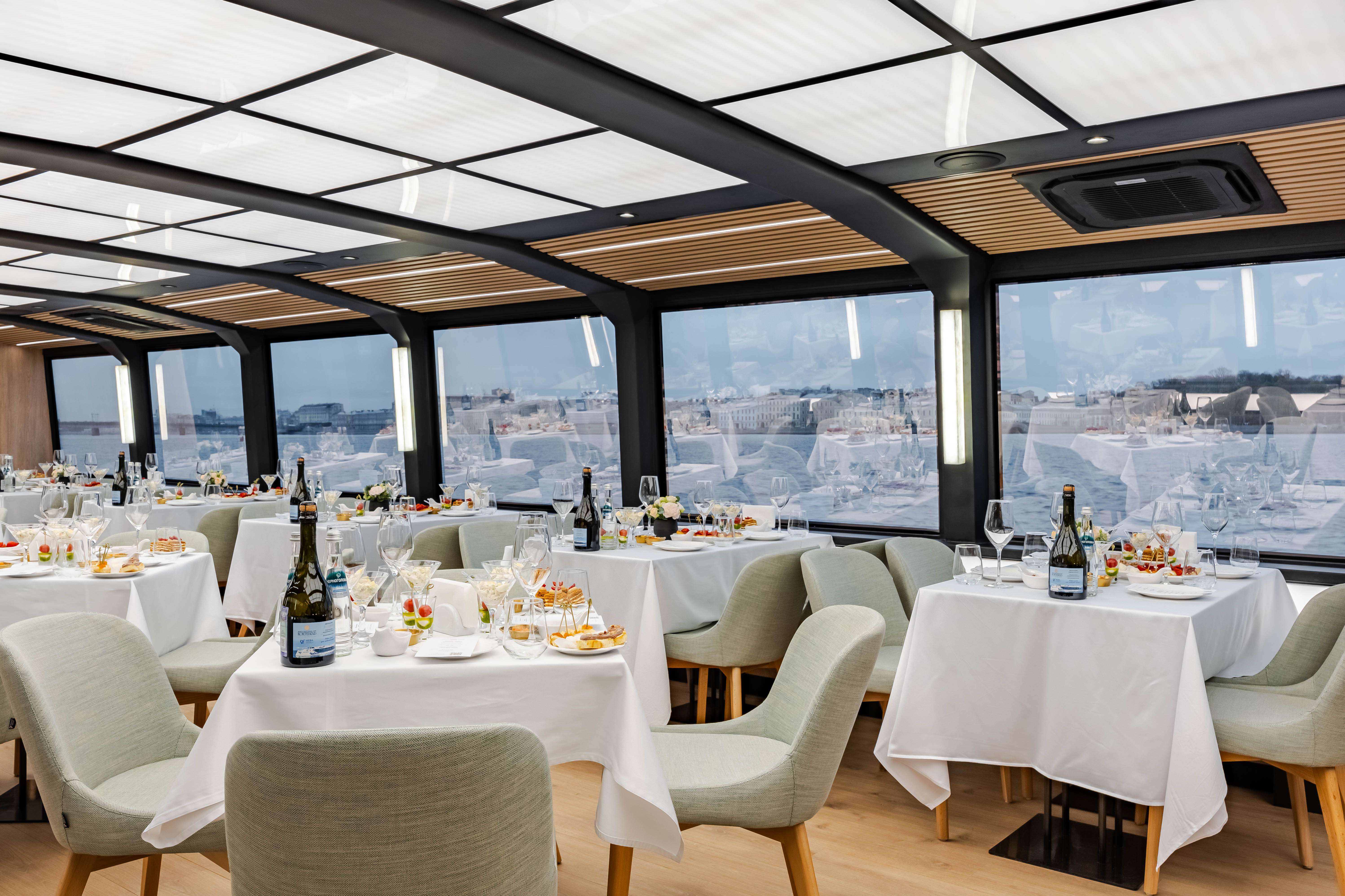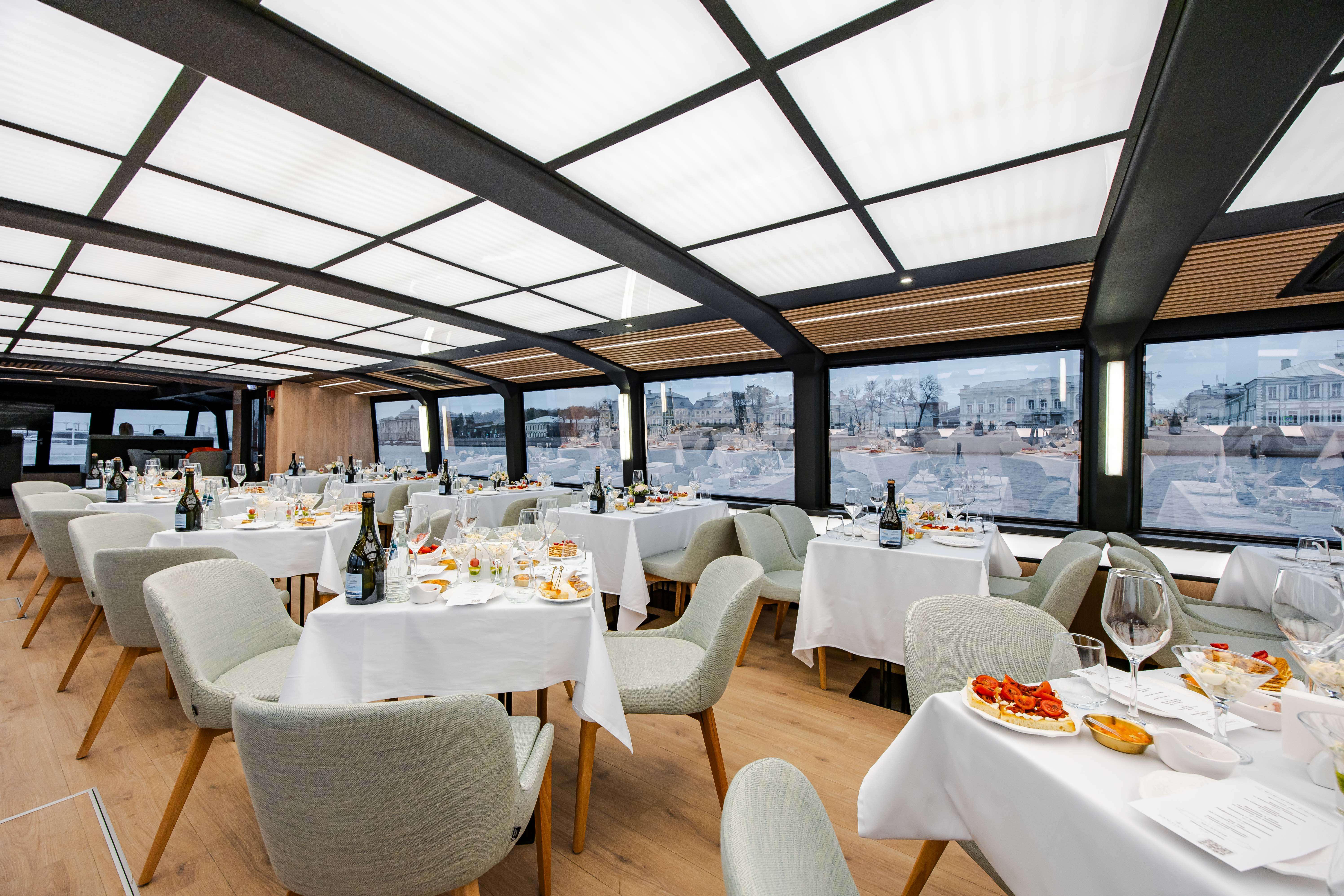 Теплоход «Москва 183» — комфортное двухпалубное судно, прошедшее реновацию в 2025 году. Просторный салон оформлен в светлых песочных тонах, а мозаичные элементы в интерьере создают особую атмосферу. Благодаря большим панорамным окнам с теплохода открываются прекрасные виды на Санкт-Петербург. Удобные посадочные места позволяют разместить гостей с комфортом, что делает судно подходящим для проведения экскурсий, торжественных мероприятий и деловых встреч.